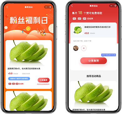采用“线上秒杀/拼团+到店自提”的方式,充分利用微信粉丝圈,实现用户分享裂变转化,并帮助门店吸粉、去库存、复购、线下引流等作用,是线上必不可少的营销工具分享集赞 传播裂变